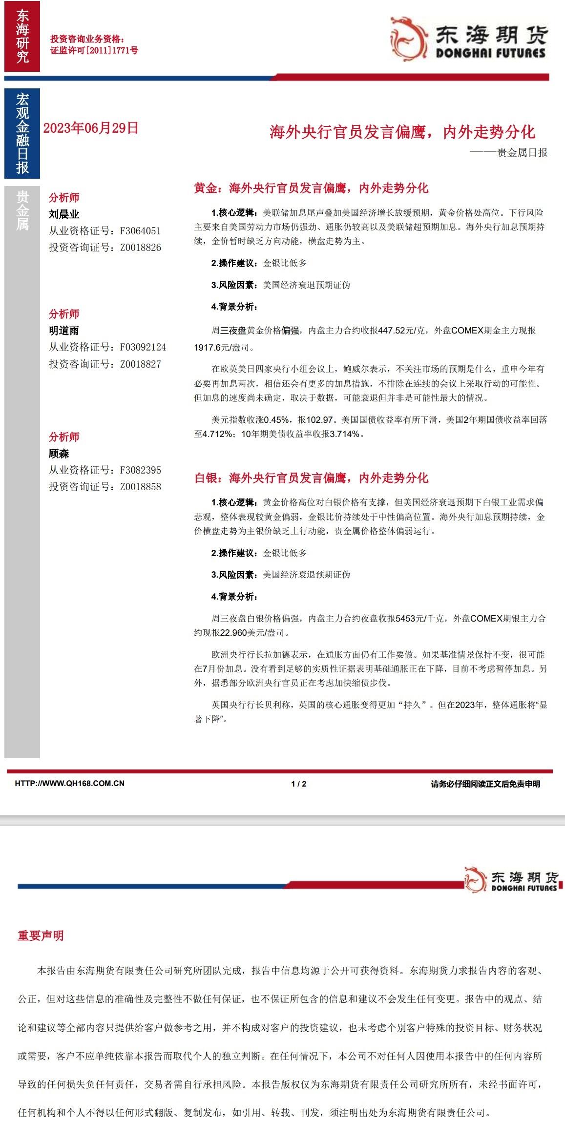 标题:【东海期货6月29日产业链日报】贵金属篇:海外央行官员发言偏鹰,内外走势分化