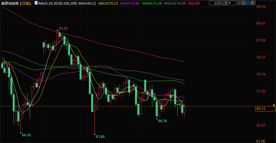 布伦特原油期货上涨2.5%,结算价报每桶74.03美元,美国原油期货上涨2.8%,结算价报每桶69.56美元。