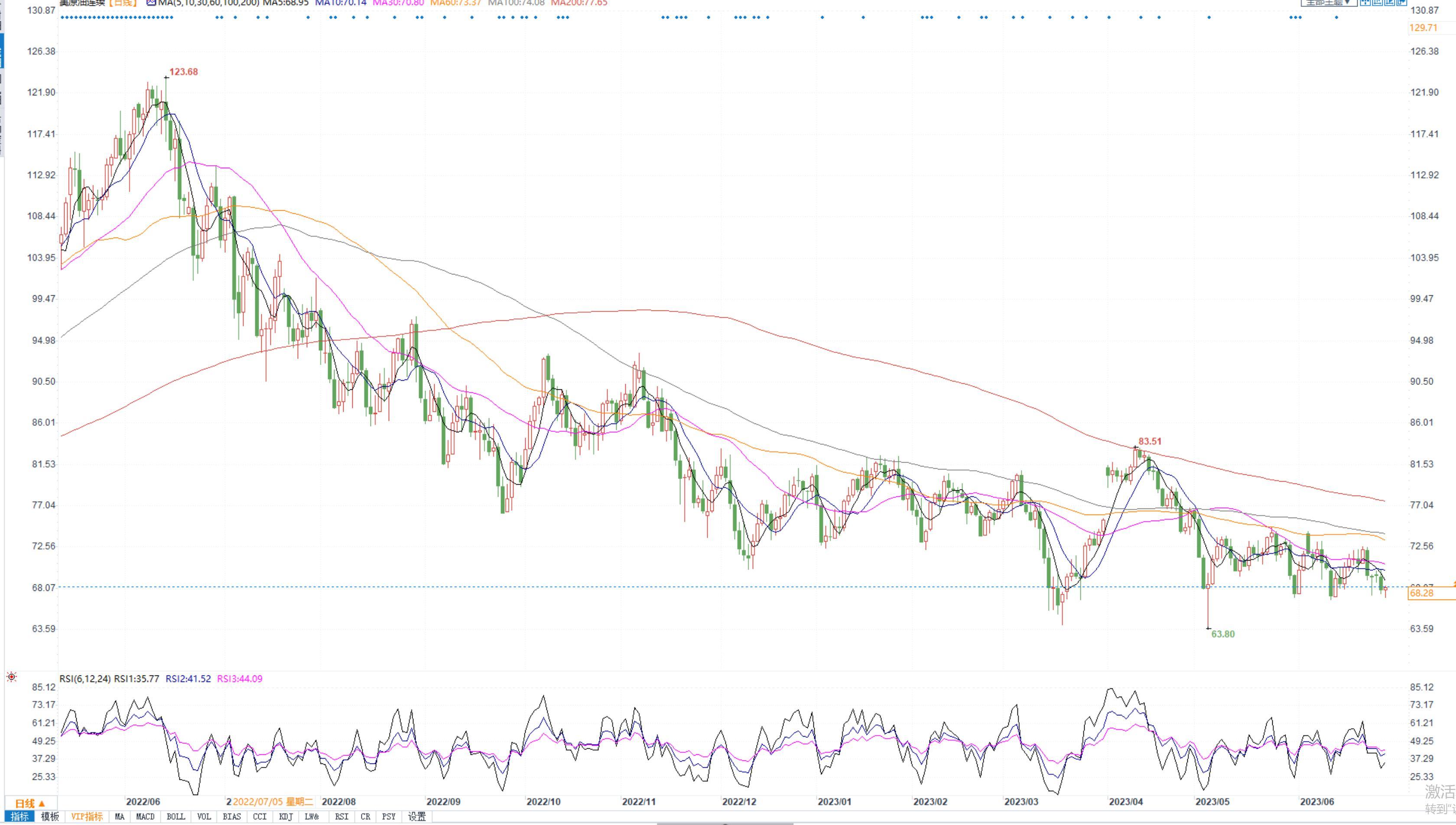 周三国内原油价格小幅震荡回调。美联储主席鲍威尔上周四表示,美联储从现在开始将以“谨慎的步伐”调整利率,联邦公开市场委员会的绝大多数委员认为将进一步加息。沙特将于7月份单方面额外减少每日100万桶原油产量,加上季节性需求强劲,有助于在第三季度实际收紧市场。美国汽车协会估计,在美国这个独立日周末,将有4300万驾车者从家中驾车行驶50英里或以上,比2019年增加了4%。美国石油学会数据显示,上周美国原油库存和汽油库存减少、馏分油库存增加。截止6月23日当周,美国商业原油库存减少约240万桶,汽油库存减少约290万桶,馏分油库存增加约77.7万桶。海运费回落以及人民币贬值放缓,国内油价出现震荡回调。技术面,国内INE油价短期维持震荡偏弱。操作建议:震荡偏空思路操作。