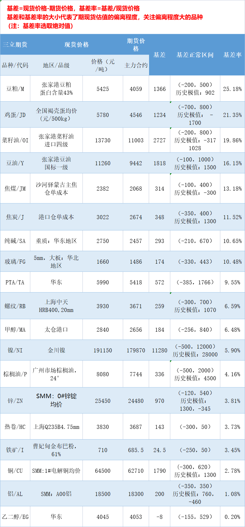 三立期货10月18日基差:一张图尽览有色金属、黑色系、能源化工和农产品基差(按基差率从大到小排序)——排名前三的期货品种分别是豆粕、鸡蛋、菜籽油,基差率分别是25.18%、21.35%、19.86%。