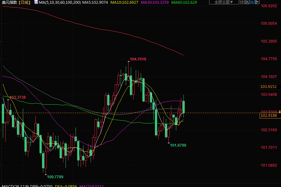 美元指数在之前两个交易日中上涨了0.82%,此前美联储主席鲍威尔的发言和稳健的经济数据增强了市场对联储今年将再加息两次的预期,同时降低了对年底前可能降息的预期。