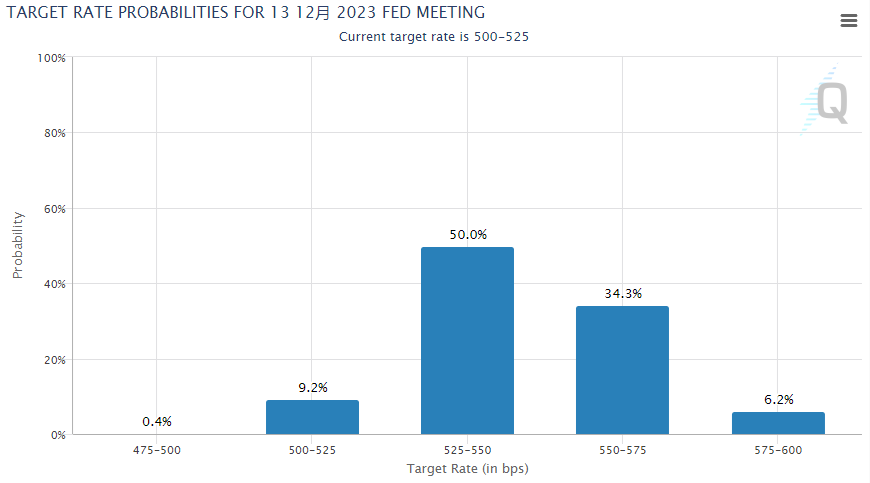 但根据CME的“联储观察”工具,投资者目前预计美联储下半年仅加息一次,即7月份加息25个基点,联邦基金利率区间升至5.25%-5.50%后将保持到年底。