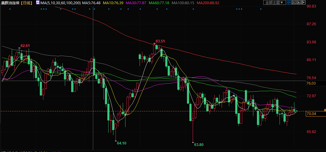 美原油交投于70.13美元/桶附近;油价周一收跌1%,对全球经济放缓和美国可能加息的担忧盖过了主要出口国沙特阿拉伯和俄罗斯宣布8月降低供应的影响。