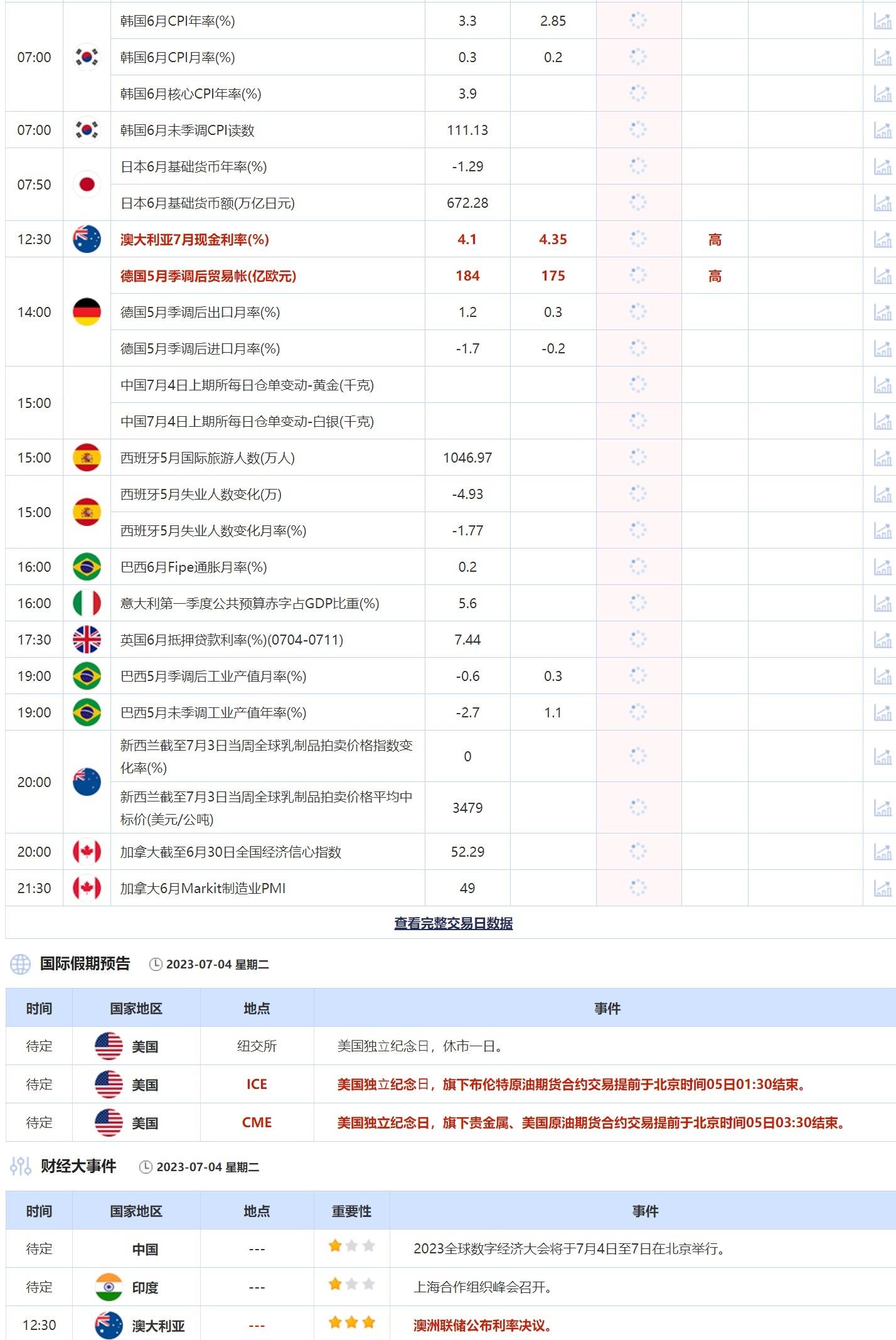 汇通财经APP讯——7月4日,投资者需要关注的重点数据:韩国6月CPI,德国5月季调后贸易帐,德国5月季调后出口月率,德国5月季调后进口月率,加拿大截至6月30日全国经济信心指数。需要关注的大事件包括澳洲联储公布利率决议,美国相关交易所在独立日的休市公告。