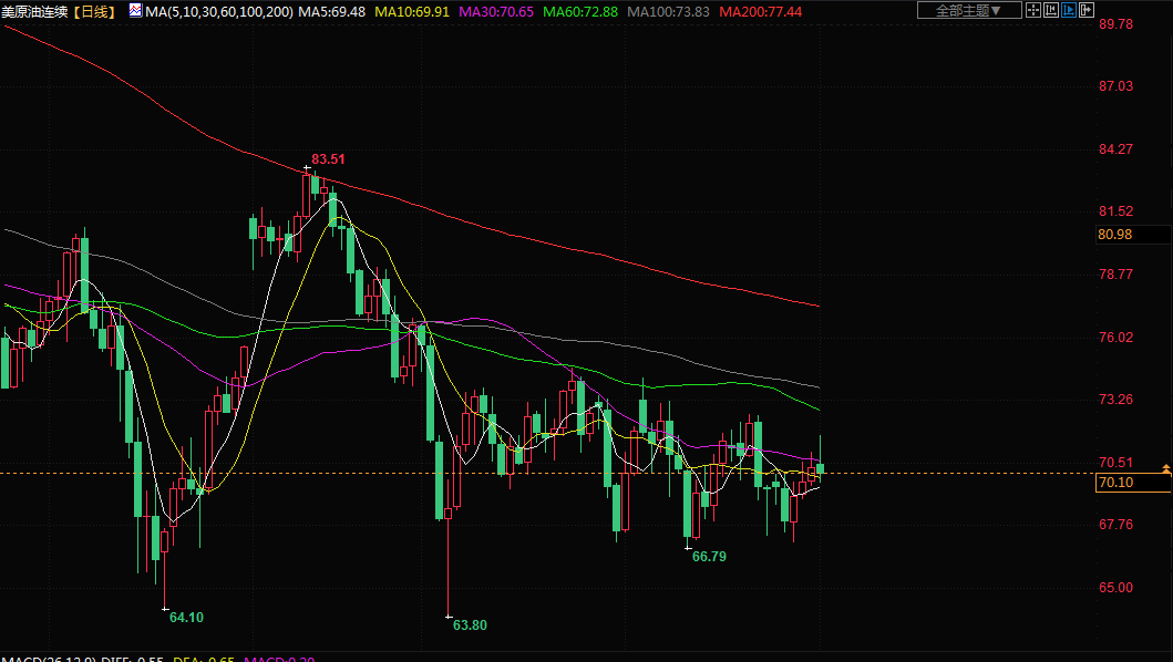 布伦特原油期货下跌1%,,结算价报每桶74.65美元;美国原油期货下跌1.2%,报69.79美元。