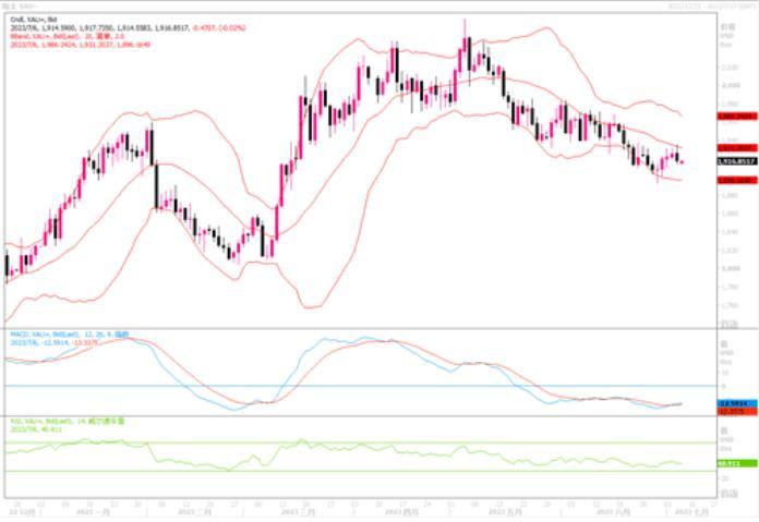 现货黄金在窄幅波动中出现冲高回落行情,当日下跌0.53%,全日以最低1914.60美元/盎司水平收盘。