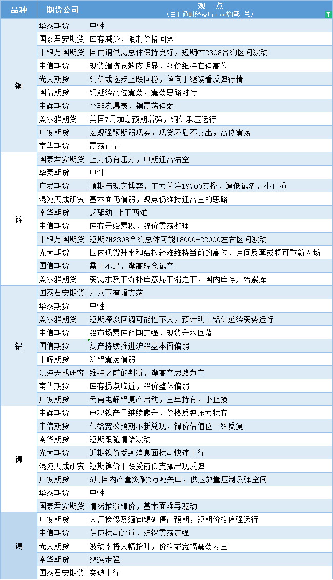 标题:期货公司观点汇总一张图:7月7日有色系(铜、锌、铝、镍、锡等)