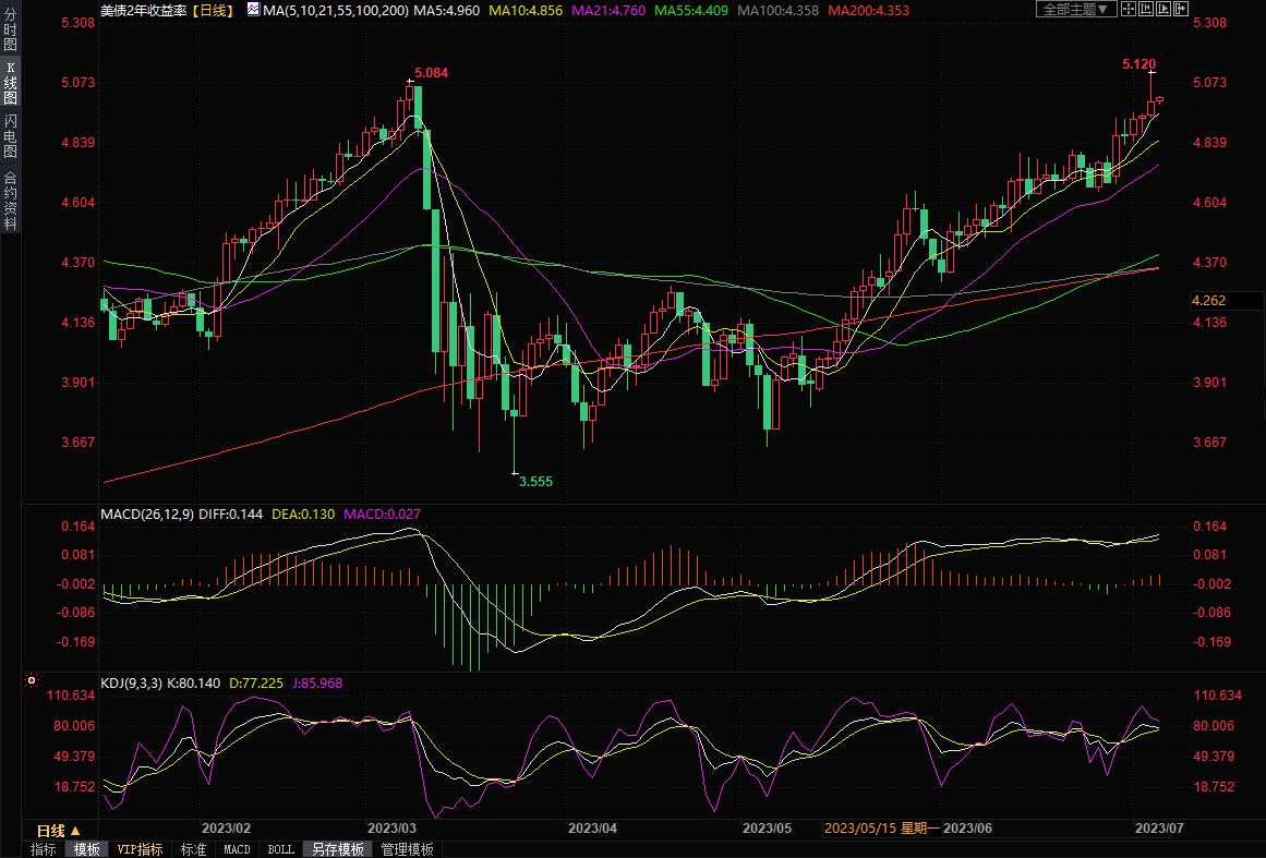 10年期国债收益率周四上升9.4个基点至4.039%,盘中触及4.083%的3月2日以来最高,10年期国债收益率录得连续第三个交易日上涨。利率期货市场走势显示,美联储在7月25-26日会议上加息25个基点的可能性为92.4%,高于前一天的90.5%,。