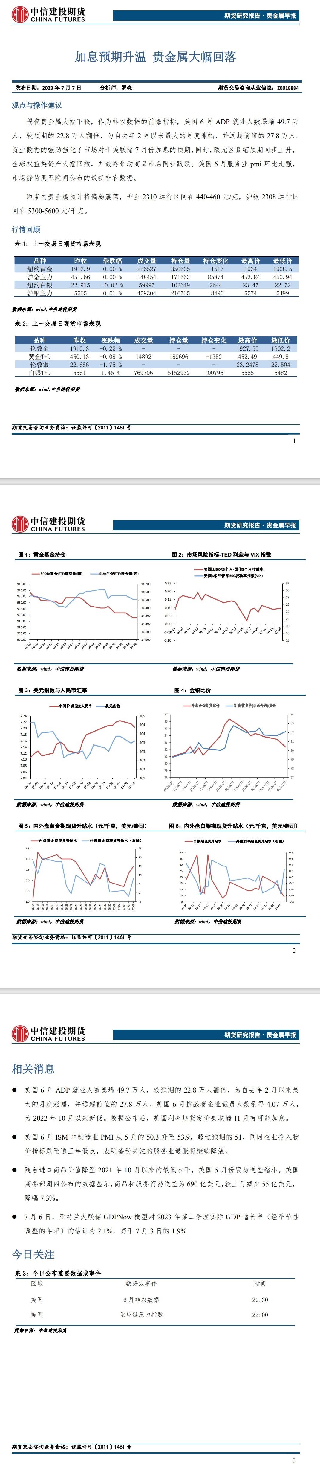 标题:中信建投期货7月7日贵金属报告:加息预期升温 贵金属大幅回落