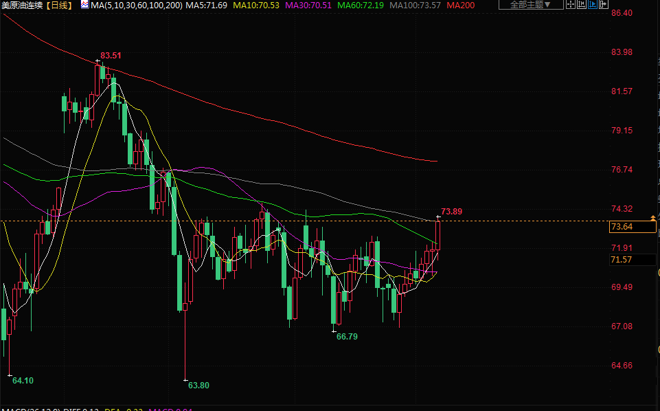 布伦特原油创下5月1日以来最高收盘水平,美国原油创下5月24日以来最高收盘水平。两大指标合约周线均上涨约5%。