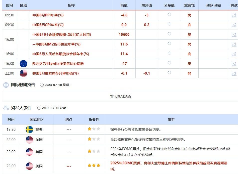 ①7月10日(周一)关键字:欧元区7月Sentix投资者信心指数,克利夫兰联储主席梅斯特