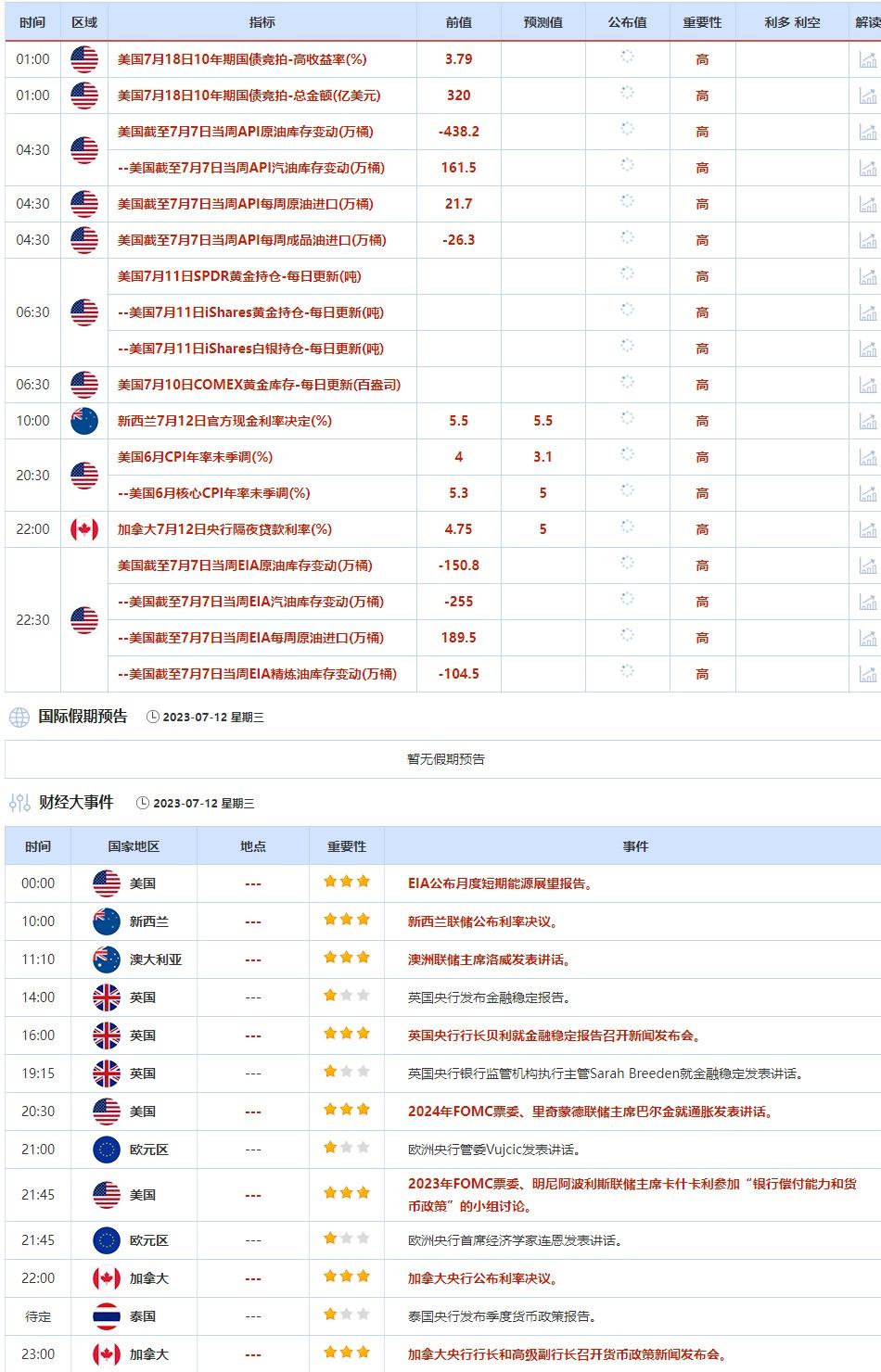 一项调查显示,新西兰联储很可能在7月12日和今年余下时间内将利率维持在5.50%不变,这标志着其长达20个月的加息周期结束。但是,新西兰银行预计新西兰联储将于7月将利率上调至5.75%。 7月12日,英国央行行长贝利就金融稳定报告召开新闻发布会。此外,2024年FOMC票委、里奇蒙德联储主席巴尔金就通胀发表讲话。这都是当天投资者需要关注的大事。