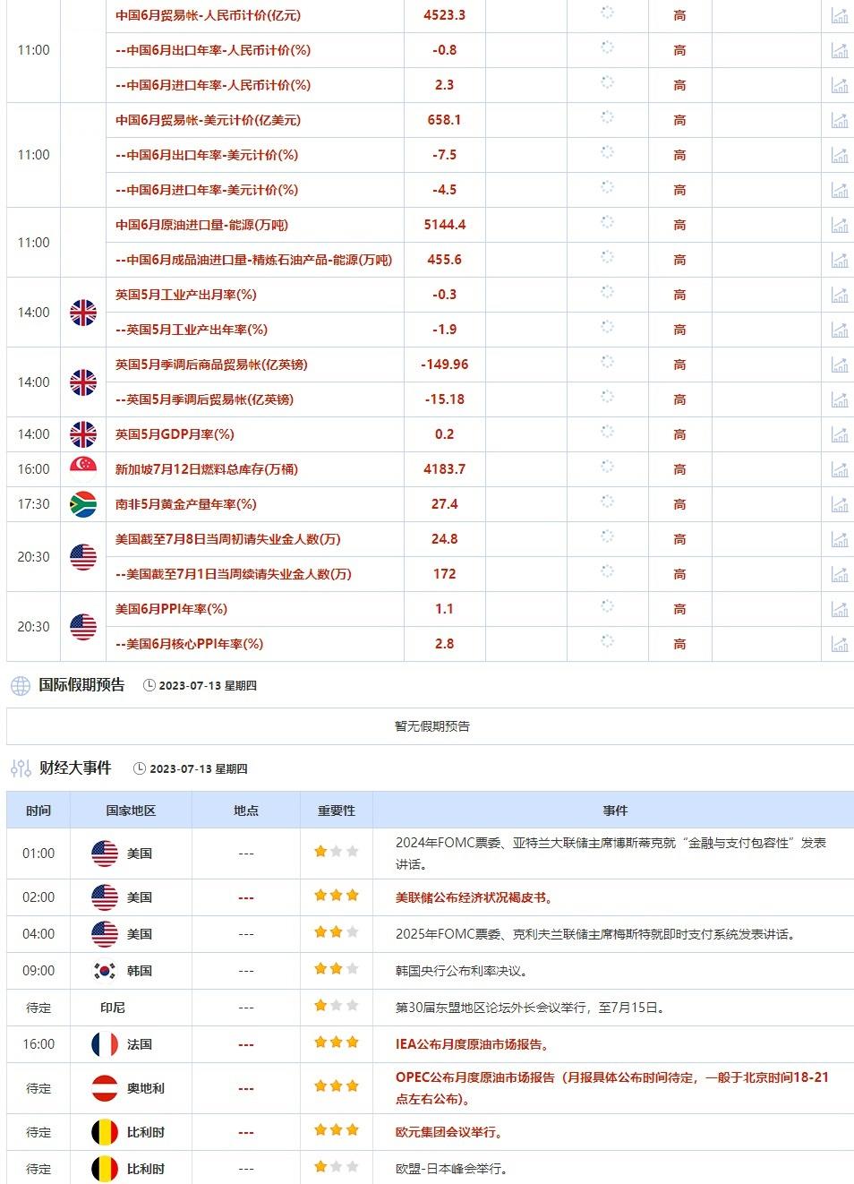 7月13日,美联储将经济状况褐皮书,投资者可以从中了解美国经济情况,需引起重视。此外,当天IEA公布月度原油市场报告, OPEC公布月度原油市场报告,可能影响油价。此外,7月13日,欧元集团会议将开始举行,也是需要关注的大事。