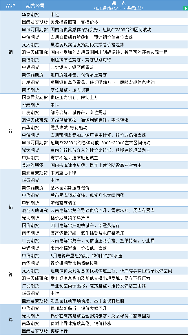 标题:期货公司观点汇总一张图:7月10日有色系(铜、锌、铝、镍、锡等)