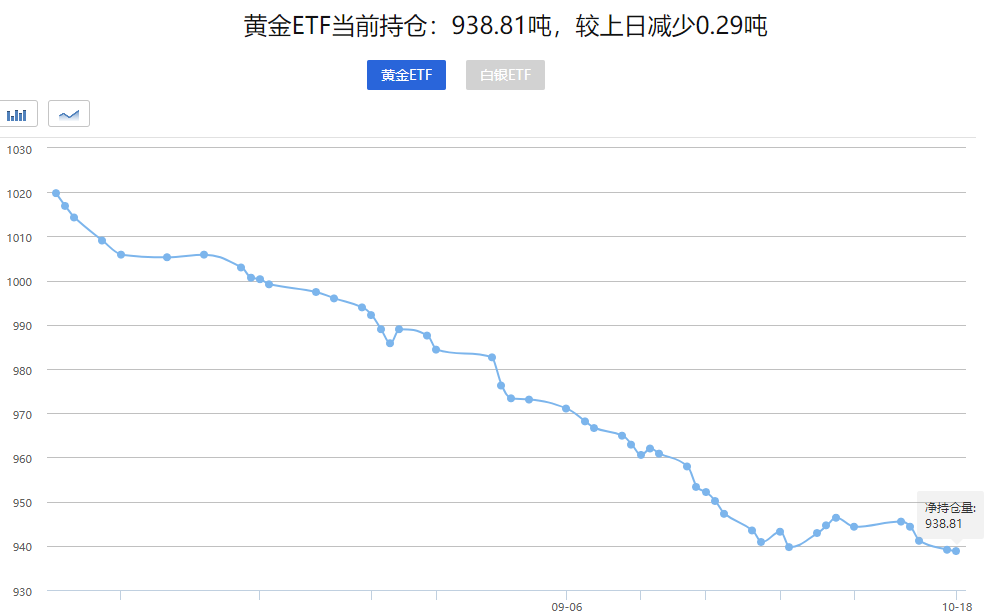 【黄金ETF持仓持续下降】10月19日黄金ETFs数据显示,截止10月18日全球最大的黄金ETF-SPDR Gold Trust的黄金持仓量938.81吨,为2020年3月底以来新低,较上一交易日减少0.29吨,为连续第四个交易日下降。