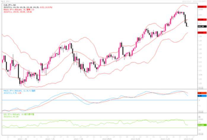 美元兑日元跌落布林带通道中轨线之下,各类技术指标开始下摆,显示