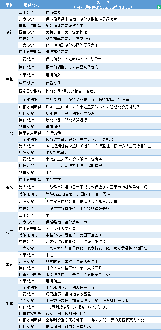 期货公司观点汇总一张图:7月11日农产品(棉花、豆粕、白糖、玉米、鸡蛋、生猪等)