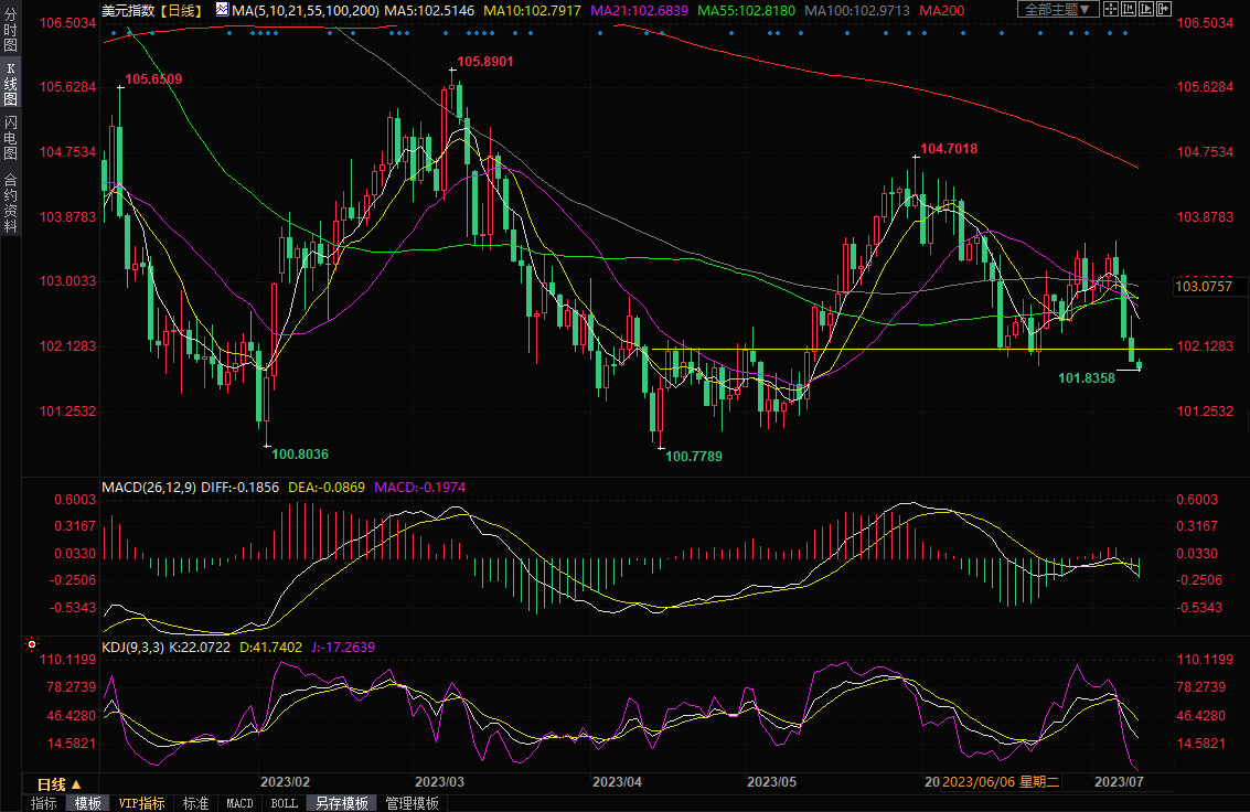 周二亚市,美元指数延续跌势,一度创建5月12日以来新低至101.83附近,因此前美联储决策者的发言强化了市场对紧缩周期接近尾声的预期。