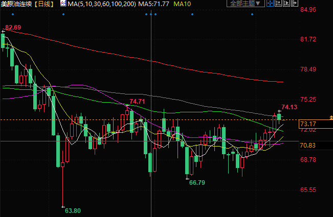美原油交投于73.34美元/桶附近;油价周一微跌,盘中一度触及一个月以来新高至74.13美元/桶,尽管受累于美国加息的可能性越来越大,但IEA预计油市今年下半年将趋紧,因需求强劲和OPEC+减产限制了油价跌幅。