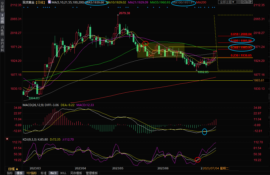 整体来看,虽然加拿大央行继续加息,美联储7月份大概率也仍将再加息一次,这增加了持有黄金的机会成本,但在美国通胀数据后,对美联储将进入加息周期尾声的预期进一步笼罩市场,美元和美债收益率持续大跌,鼓舞了黄金多头士气,金价攻克100日均线阻力后,短线看涨信号进一步增强,后市有望进一步试探5月24日触及的近两个月高点1985附近阻力,2079-1892跌势的50%回撤位阻力也在该位置附近。下方留意5日均线1940附近支撑。北京时间10:18,