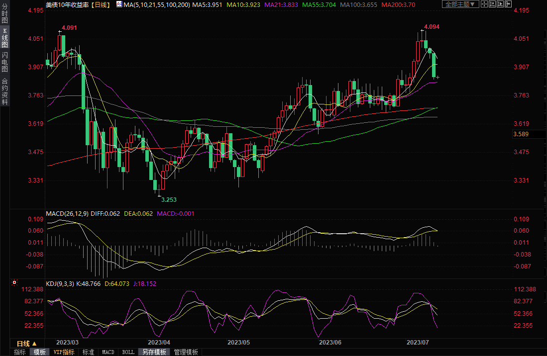 10年期国债收益率从数据公布前的3.945%左右降至3.861%,周三收跌3.06%,为连续三个交易日下跌,该收益率上周五触及八个月高点4.094%。对利率敏感的两年期国债收益率周三从4.845%左右降至4.742%。上周四该收益率达到5.12%,为2007年6月以来最高。
