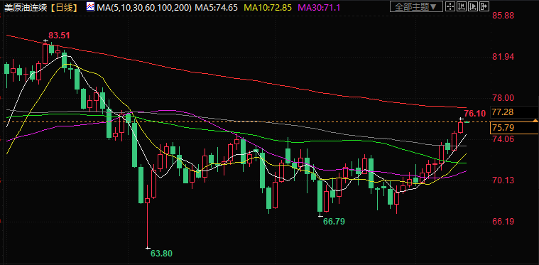 美原油交投于75.81美元/桶附近;油价周三收高,美油站上75美元/桶关口,触及两个月来最高至76.10美元/桶,