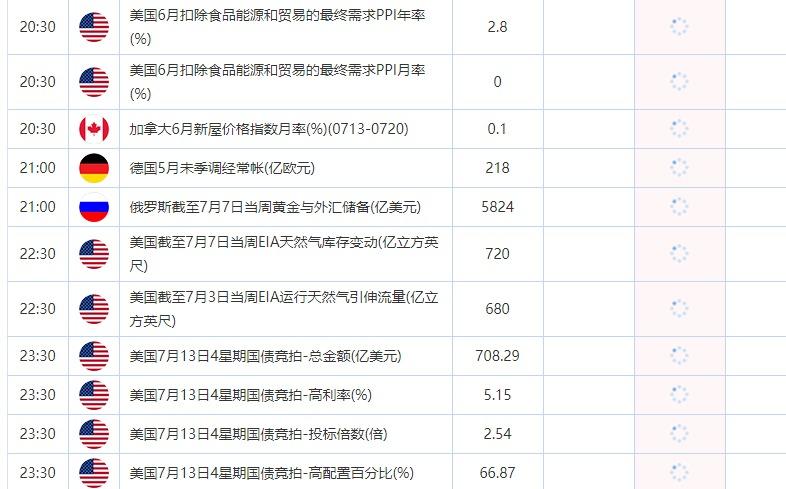 20:30 美国6月核心PPI年率(%) , 前值 2.8 , 预期值 2.6 , 公布值:待发布20:30 美国6月扣除食品能源和贸易的最终需求PPI年率(%) , 前值 2.8 , 预期值 -- , 公布值:待发布