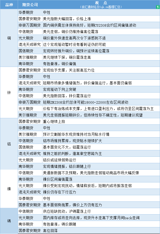 标题:期货公司观点汇总一张图:7月14日有色系(铜、锌、铝、镍、锡等)