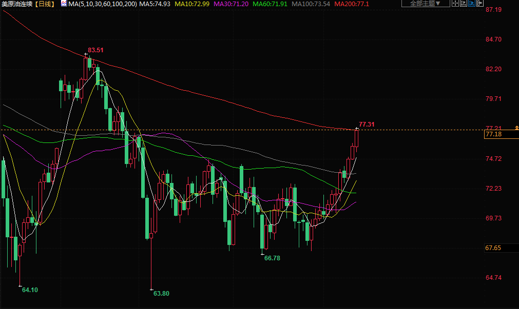 布伦特原油期货上涨1.6%,结算价报每桶81.36美元。盘中一度触及81.57美元,为4月25日以来最高。美国原油期货上涨1.5%,报76.89美元。盘中一度触及77.13美元,为4月26日以来最高。