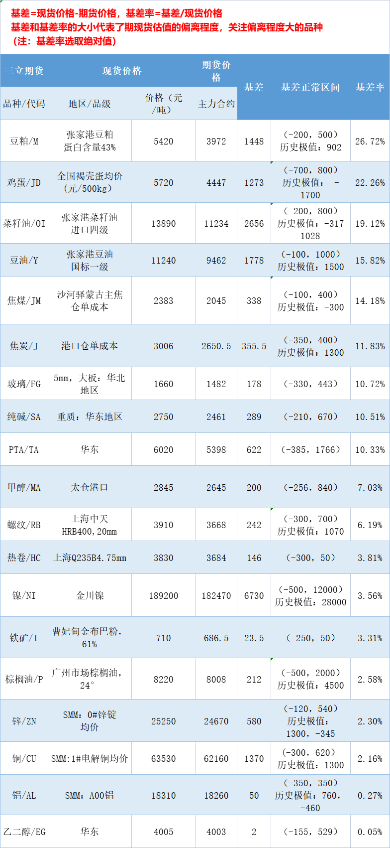 三立期货10月19日基差:一张图尽览有色金属、黑色系、能源化工和农产品基差(按基差率从大到小排序)——排名前三的期货品种分别是豆粕、鸡蛋、菜籽油,基差率分别是26.72%、22.26%、19.12%。