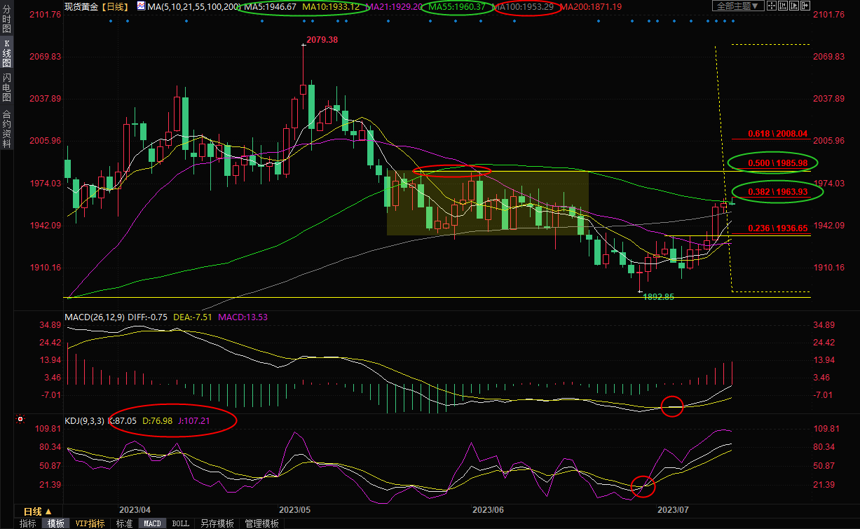 由于MACD金叉运行,KDJ金叉运行,在失守5日均线前,后市整体仍偏向多头,若能定欧派1963.93附近阻力,则增加后市看涨信号,进一步阻力在布林线上轨1970关口附近,然后是1980关口阻力,较强的阻力在50%回撤位1985.98附近,5月24日高点阻力也在该位置附近;该位置附近阻力较强,如果进一步上破,有有望看向2000关口上方。
