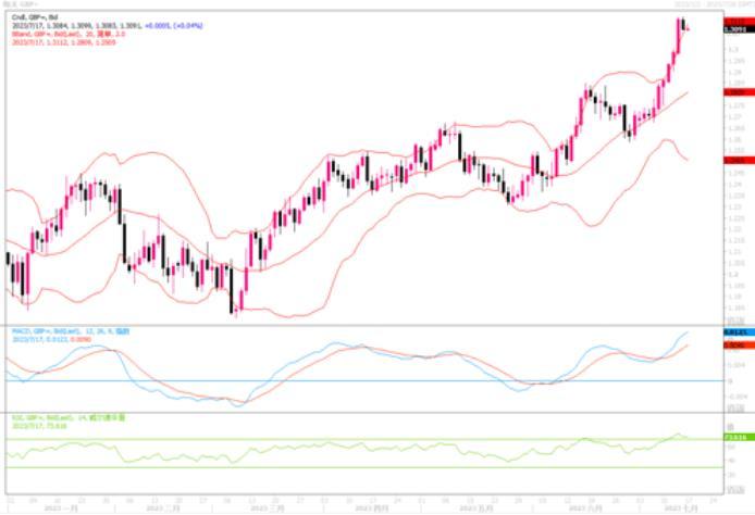 欧元兑美元亚洲时段触及16个月高位1.1245美元,随后至纽约收盘阶段略回软,持平于1.1229美元。美元在过去几天大幅下跌后周五略反弹,因投资者在周末前进行一些整固性的反弹交易。最近美元的全面走软,主要是因美国反应通胀的数据接连出现明显下降,导致市场对美联储已接近加息周期尾声的预期大幅升温。利差优势行将不复存在的刺激下,欧元等一干非美货币是借机大幅蹿升。由著名经济学家在给客户的报告中写道,由于欧洲居民心态愈加乐观、服务业活动以及旅游业强劲。他预估欧元区第二季度GDP将小幅增长0.1%。在经济衰退的忧虑逐渐降低,且与美元利差渐渐有望缩小的大环境下,欧元或会继续得到一定的支撑。但从技术图形上观察,日线级别图上似乎有顶背离迹象,须防范近期由于欧元累计升幅过大出现获利回吐调整行情。上方重要的阻力水平在1.1280附近,而下方的支撑依次落在1.1150、1.1036。