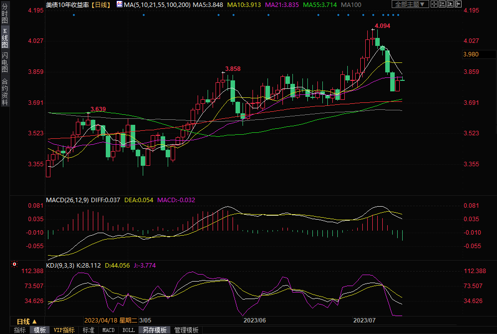 10年期国债收益率上涨6个基点,至3.819%,但低于7月8日触及的八个月高位4.094%。两年期国债收益率上上涨14个基点,至4.751%,7月6日曾触及5.120%,为2007年6月以来最高。