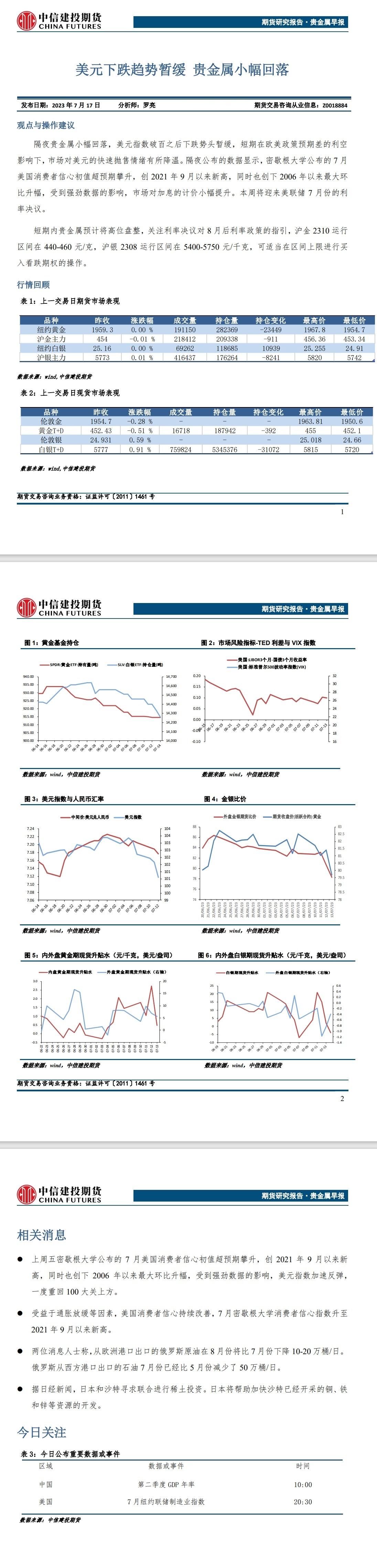 标题:中信建投期货7月17日贵金属早报:美元下跌趋势暂缓 贵金属小幅回落