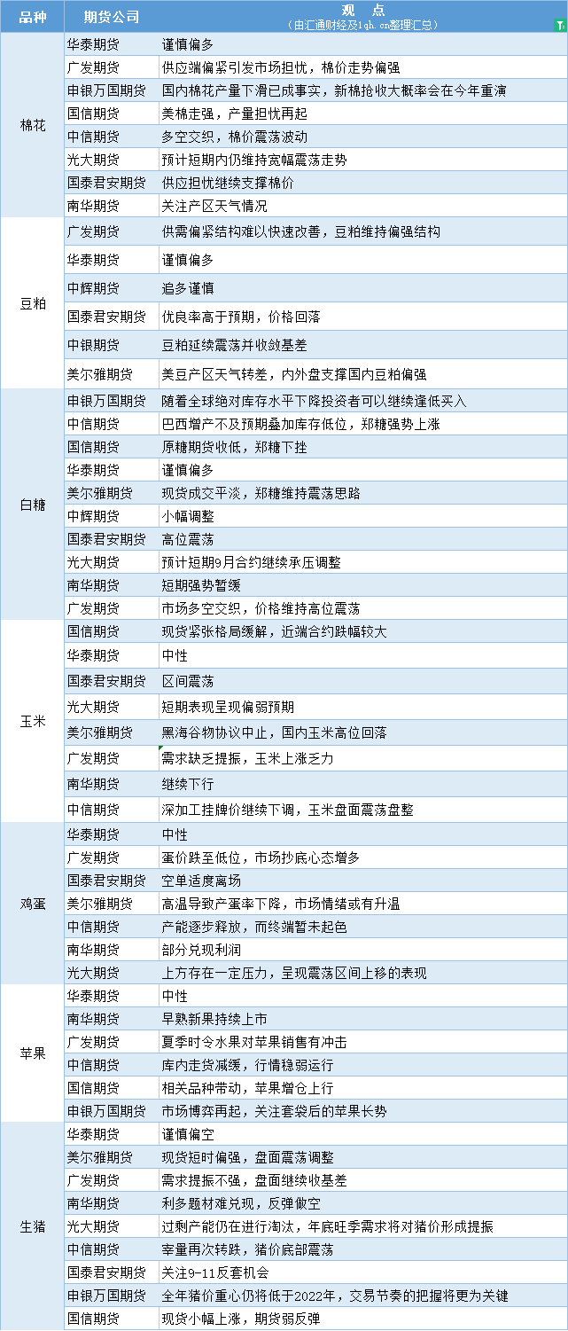 标题:期货公司观点汇总一张图:7月18日农产品(棉花、豆粕、白糖、玉米、鸡蛋、生猪等)
