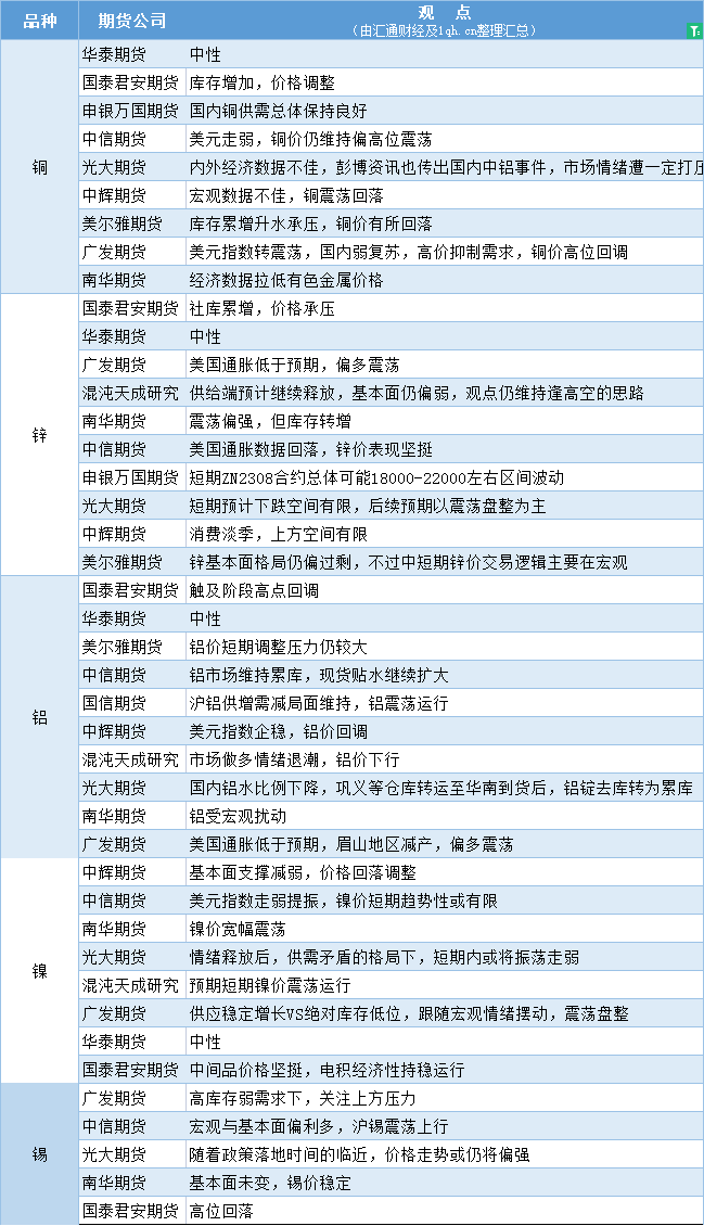 标题:期货公司观点汇总一张图:7月18日有色系(铜、锌、铝、镍、锡等)