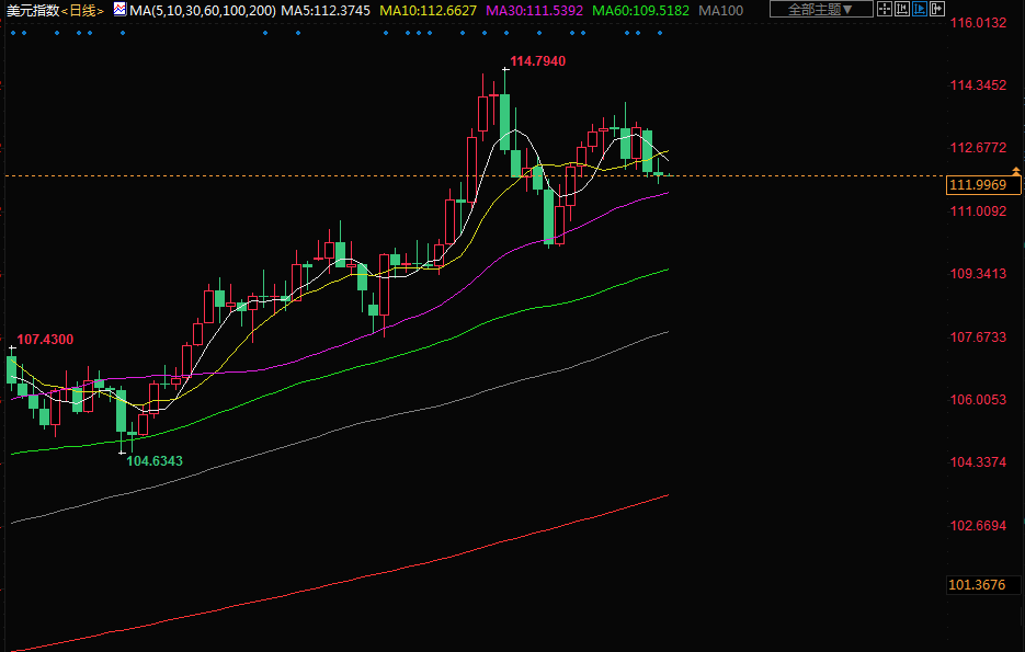 美元指数交投于112附近;美元兑一篮子货币周二收跌,盘中一度滑落至111.76的近两周低点,全球金融市场风险偏好恢复使其涨幅受到限制;