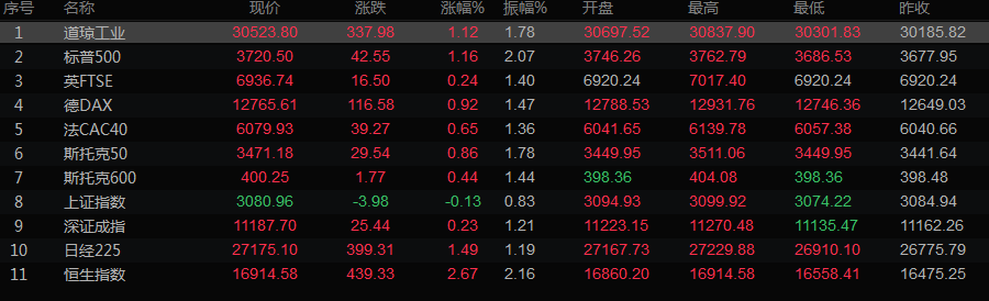 标普500指数收盘上涨1.23%,报3723.10点;纳斯达克综合指数收盘上涨0.90%,报10772.40点。