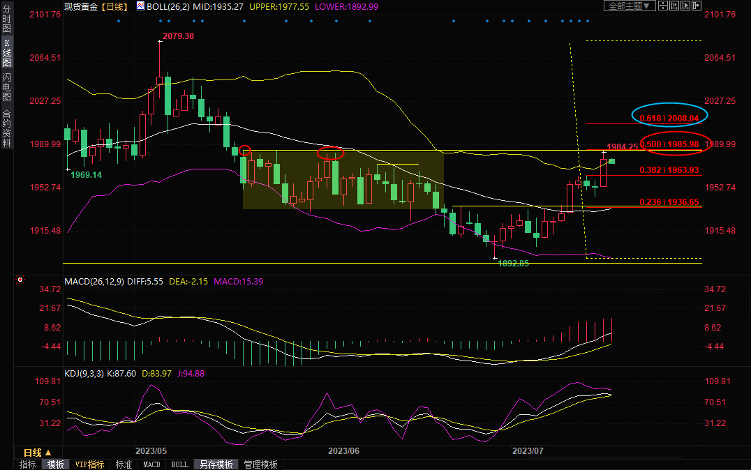 现货黄金震荡微跌,目前交投于1974.90美元/盎司附近,因隔夜美股大涨打压避险情绪,但金价仍守住了隔夜大部分涨幅。周二金价强势上涨近30美元,顶破了多重阻力压力,一度创近两个月新高至1984.25美元/盎司,收报1978.54美元/盎司,因美国6月零售销售数据弱于市场预期,进一步强化了美联储将结束加息周期,