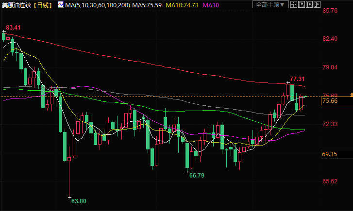 美原油交投于75.70美元/桶附近;油价周二攀升超2%,市场预期美联储将很快停止加息,而且预计美国产量将下降,早间API显示上周美国原油、汽油和馏分油库存均下降。