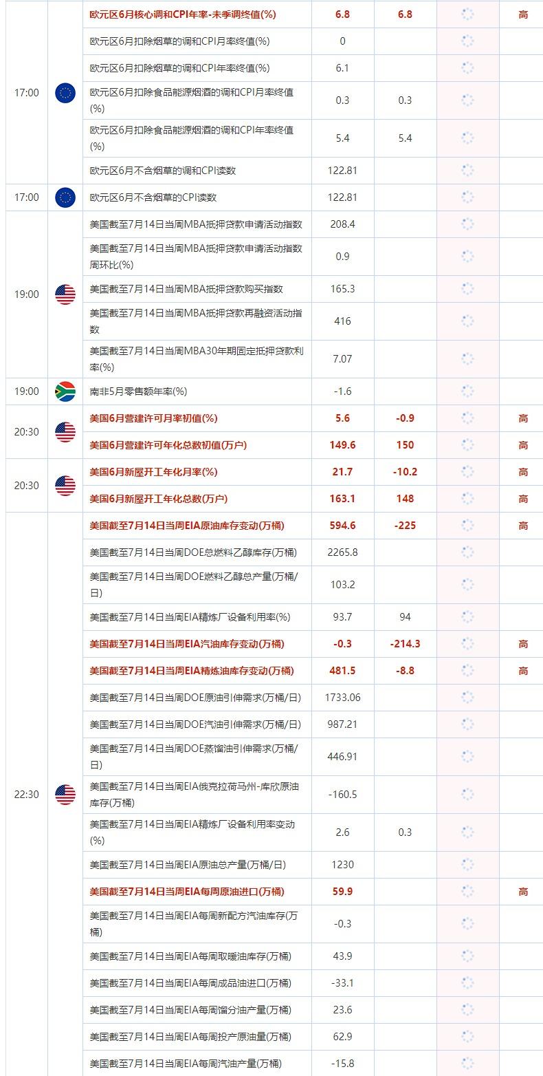 20:30 美国6月营建许可月率初值(%) , 前值 5.6 , 预期值 -0.9 , 公布值:待发布20:30 美国6月营建许可年化总数初值(万户) , 前值 149.6 , 预期值 150 , 公布值:待发布20:30 美国6月新屋开工年化月率(%) , 前值 21.7 , 预期值 -10.2 , 公布值:待发布20:30 美国6月新屋开工年化总数(万户) , 前值 163.1 , 预期值 148 , 公布值:待发布22:30 美国截至7月14日当周EIA原油库存变动(万桶) , 前值 594.6 , 预期值 -225 , 公布值:待发布22:30 美国截至7月14日当周DOE总燃料乙醇库存(万桶) , 前值 2265.8 , 预期值 -- , 公布值:待发布