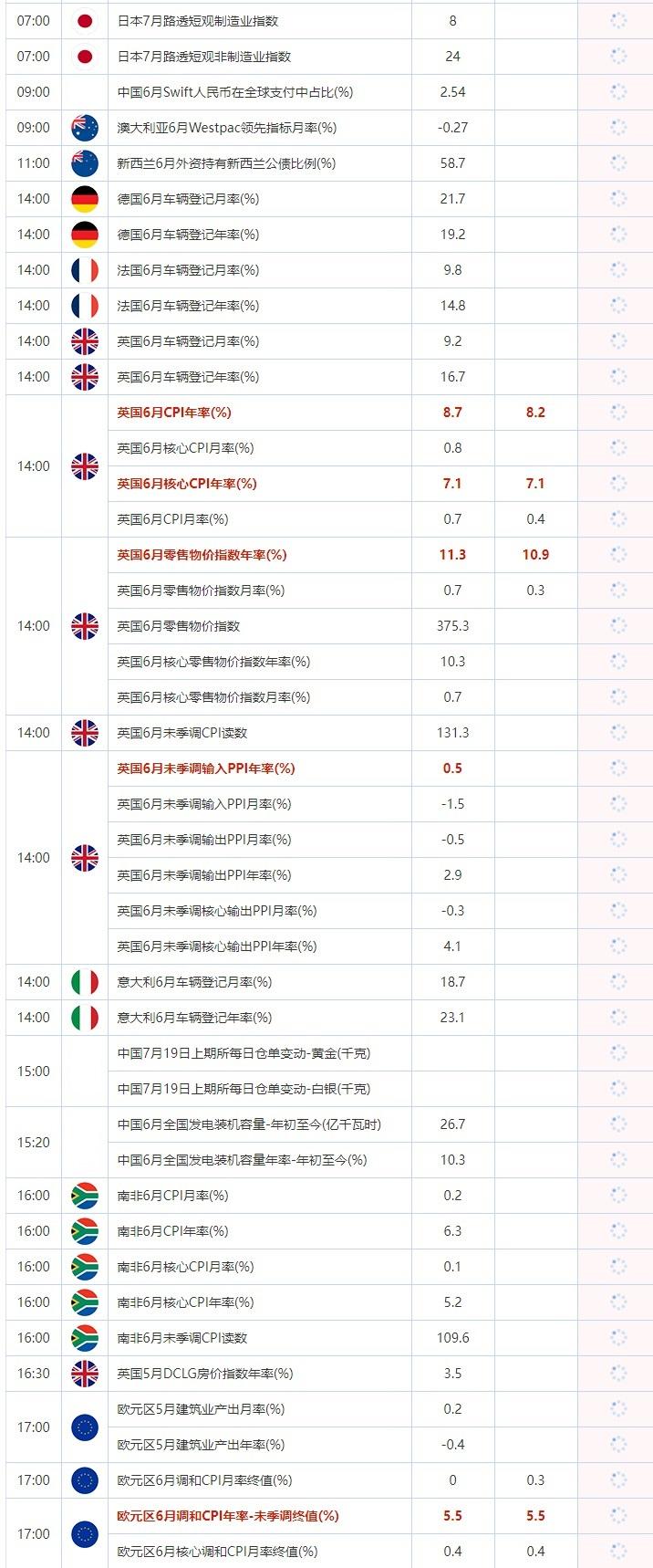 14:00 英国6月CPI年率(%) , 前值 8.7 , 预期值 8.2 , 公布值:待发布14:00 英国6月核心CPI月率(%) , 前值 0.8 , 预期值 -- , 公布值:待发布