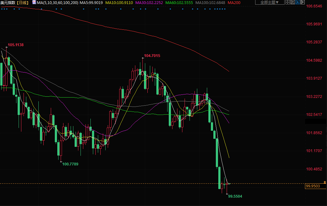 美元指数尾盘上涨0.04%,报99.924,稍早跌至99.549,为2022年4月以来最低。