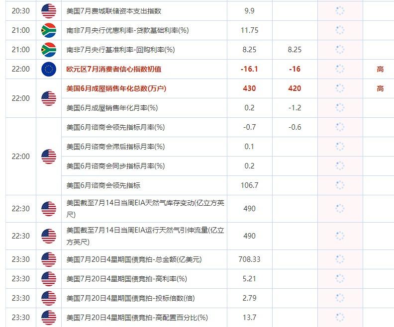 22:00 欧元区7月消费者信心指数初值 , 前值 -16.1 , 预期值 -16 , 公布值:待发布22:00 美国6月成屋销售年化总数(万户) , 前值 430 , 预期值 420 , 公布值:待发布22:00 美国6月成屋销售年化月率(%) , 前值 0.2 , 预期值 -1.2 , 公布值:待发布