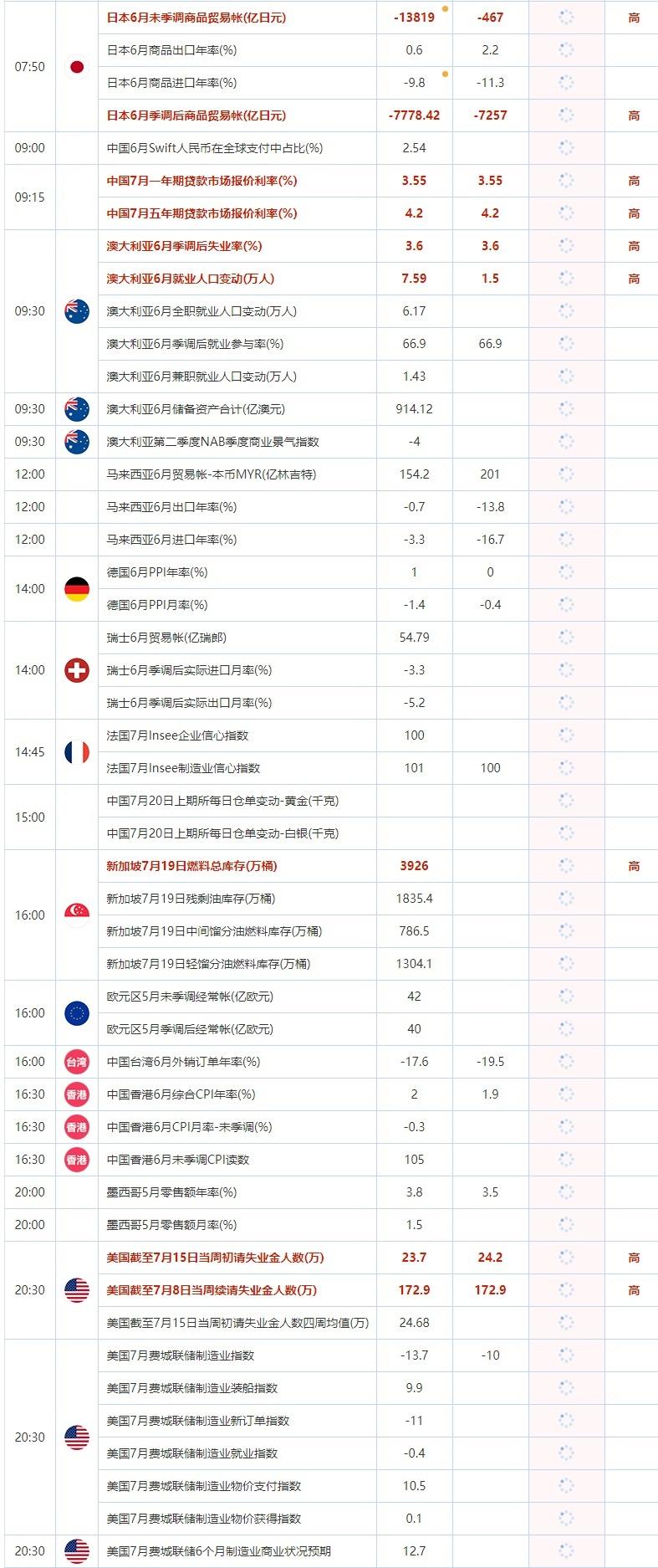 07:50 日本6月季调后商品贸易帐(亿日元) , 前值 -7778.42 , 预期值 -7257 , 公布值:待发布09:00 中国6月Swift人民币在全球支付中占比(%) , 前值 2.54 , 预期值 -- , 公布值:待发布