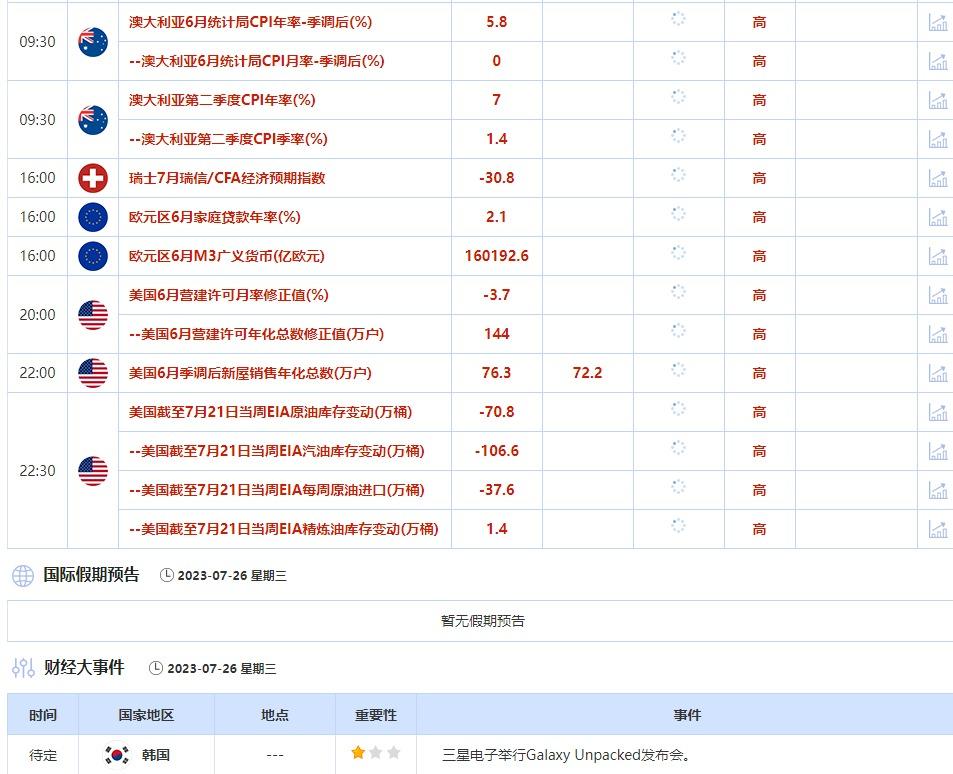 市场预期7月谘商会消费者信心指数继续上涨,预期值为113,高于109.7的前值。7月25日,IMF将公布2023年7月《世界经济展望》,或对市场有所影响,投资者也需保持关注。③7月26日(周三)关键字:美国截至7月21日当周API和EIA原油库存变动,澳大利亚6月CPI