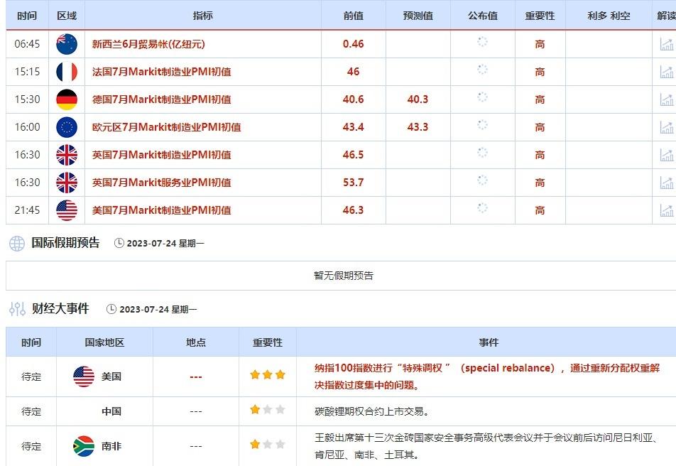 7月24日,欧元区将公布7月Markit制造业PMI初值,市场预期为43.3,略低于43.4的前值。德国将公布7月Markit制造业PMI初值,市场预期为40.3,也比40.6的前值要低。②7月25日(周二)关键字:德国7月IFO商业景气指数,美国7月谘商会消费者信心指数,IMF公布2023年7月《世界经济展望》