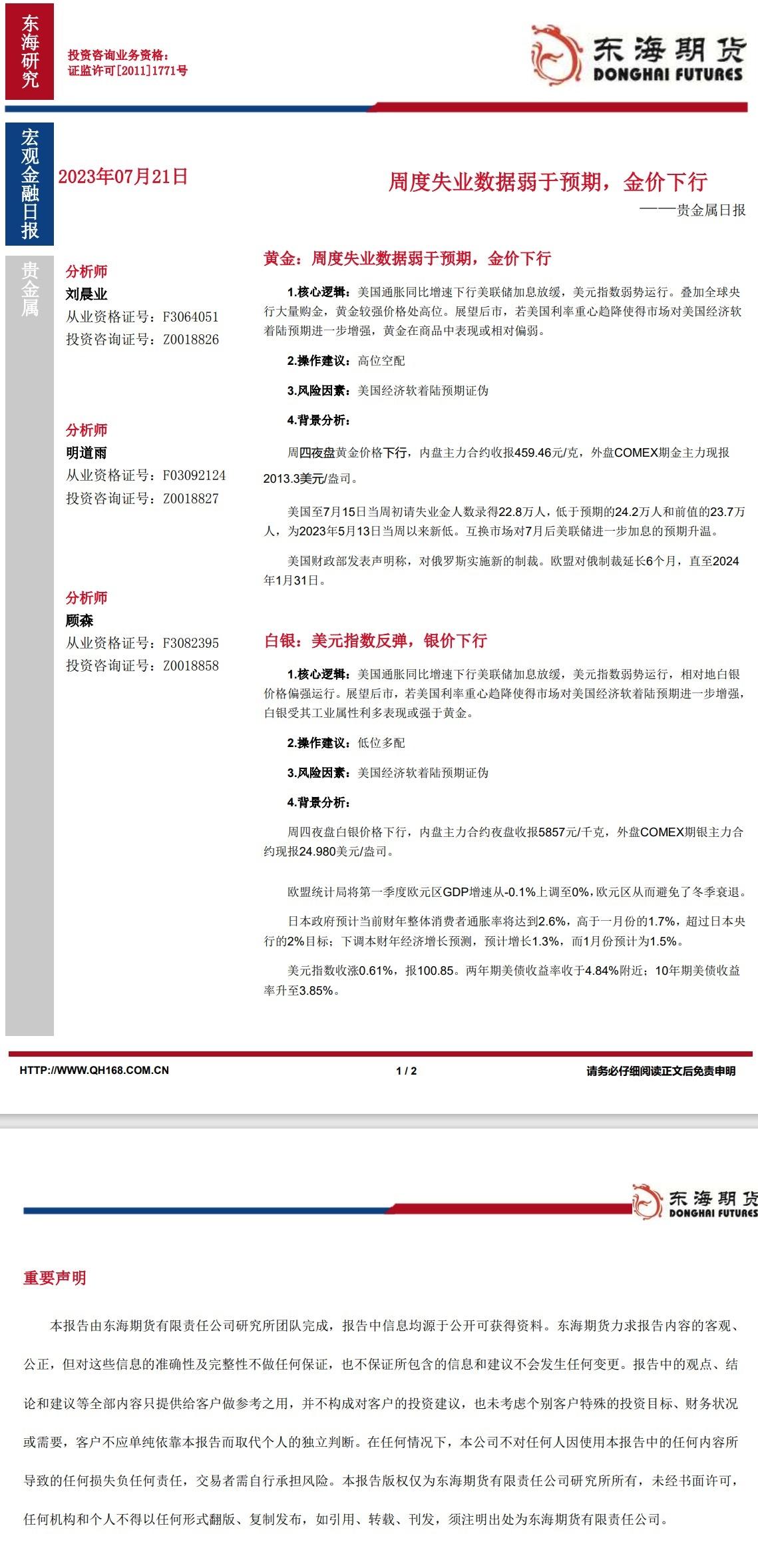 标题:【东海期货7月21日产业链日报】贵金属篇:周度失业数据弱于预期,金价下行