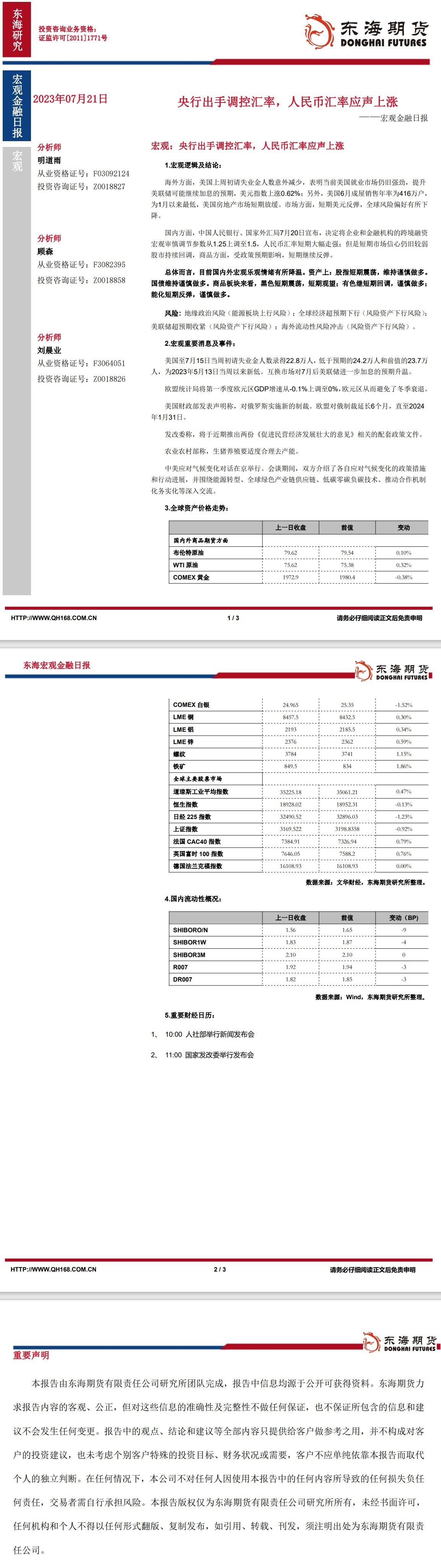 标题:【东海期货7月21日宏观金融日报】:央行出手调控汇率,人民币汇率应声上涨