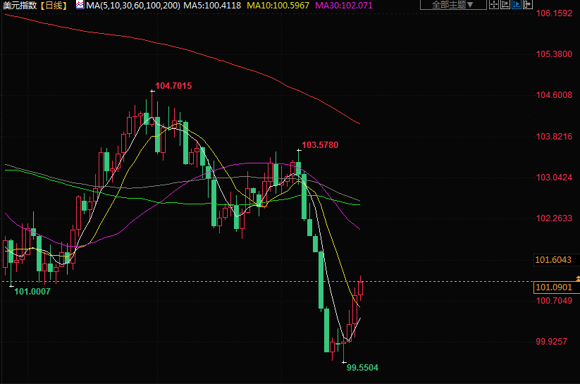 美元指数上涨0.30%,至101.06,本周上涨1.14%,创两个月来最大周线涨幅。